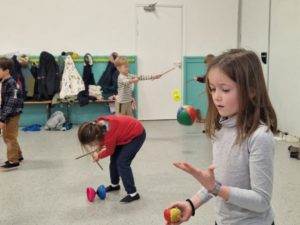 Une intervenante de l’école de Cirque Romano initie les élèves de PS, MS, GS, CP et CE1 aux arts du cirque. Pédal’go, jonglages, boule chinoise… les activités proposées sont très variées et évoluent au fil des années. A l’issue de la période, les élèves présentent un petit spectacle à leurs parents dans la salle de motricité de l’école.