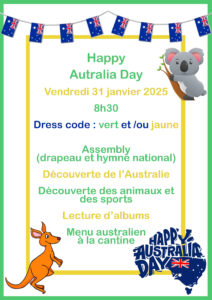 • Australia Day en 2025 : découverte de l’Australie, de ses animaux et de ses sports, dress code vert et jaune, menu Australien à la cantine…