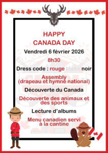 • Canada Day en 2026 : découverte du Canada, de ses animaux et de ses sports, dress code rouge, blanc, noir menu Canada à la cantine…