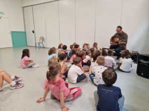 Depuis janvier 2025, le musicien Pierre Caro intervient dans toutes les classes, le mardi après-midi et le jeudi matin pendant 13 semaines. Au cours des 45 minutes d’animation, les enfants participent à de nombreuses activités : chant, découverte des différentes parties d’un instrument (saxophone, synthétiseur, guitare…), pratique du rythme à l’aide d’instruments (claves, maracas…), danse…